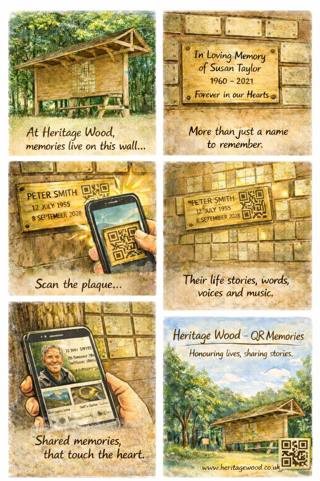 Heritage Wood QR Stories provide customers with a digital story linked to a QR code displayed on a physical plaque within Heritage Wood. The story may include written text, photographs, audio files, video links or other approved content and is intended as a personal dedication connected to a sponsored tree, table or plaque wall entry.
